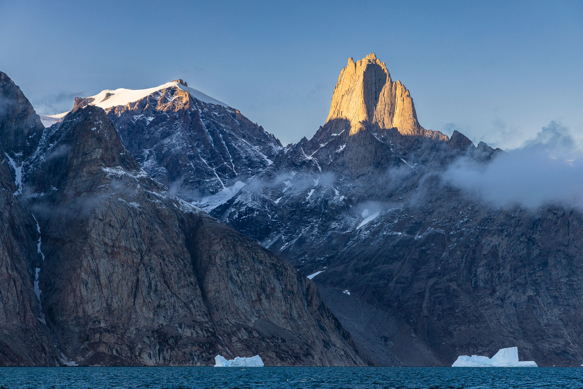 Dieser Seitenarm des Scoresbysund ist landschaftlich der wohl spektakulärste Teil dieser Fotoexpedition. Die 2.000 Meter hohen, steilen Granitwände sind ein atemberaubender Anblick aus der Perspektive unserer Segelyacht. Einige Stellen erinnern an die ikonischen Bergwelten Patagoniens. Eisberge schmücken zudem diese Passage und wir haben einen ganzen Tag Zeit in dieser fantastischen Umgebung ausgiebig zu fotografieren.